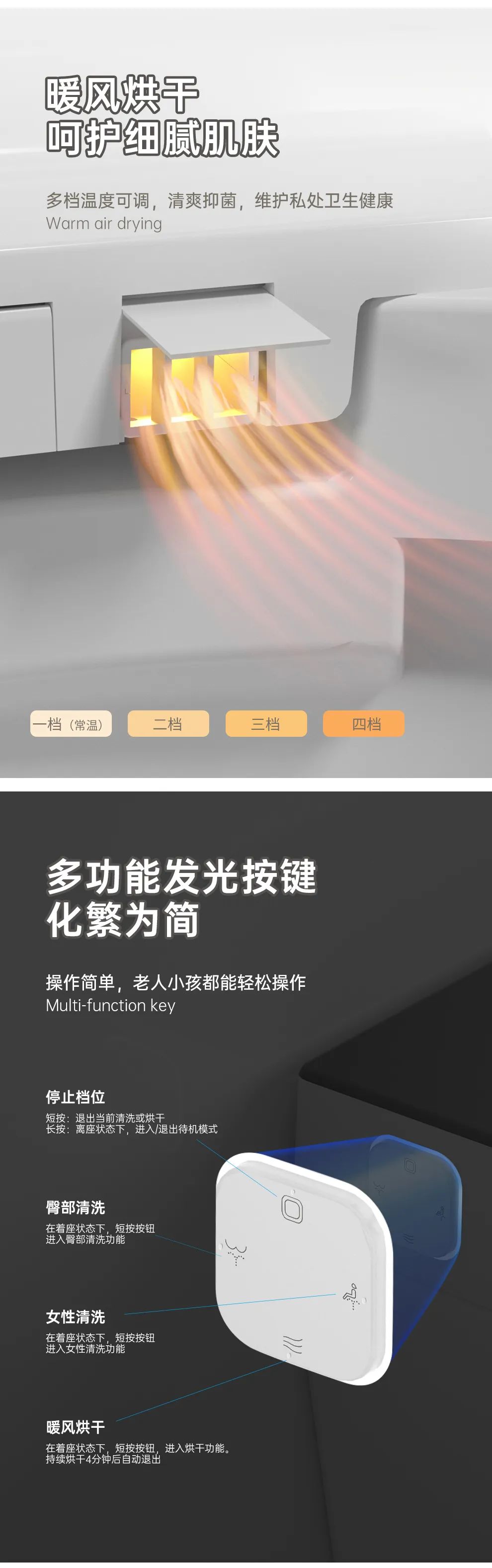 多種水洗模式,坐享健康,洗完提供暖風(fēng)烘干,多檔溫度可調(diào),清爽抑菌,維護(hù)私處衛(wèi)生健康。