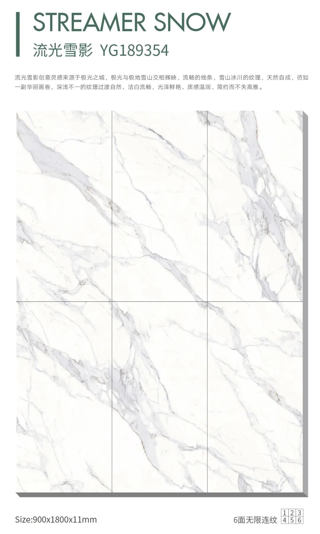 流光雪影創(chuàng)意靈感來源于極光之城,極光與極地雪山交相輝映,流暢的線條,雪山冰川的紋理,天然自成,彷如副華麗畫卷,深淺不一的紋理過渡自然、潔白流暢,光澤鮮艷、質(zhì)感溫潤,簡約而不失高雅