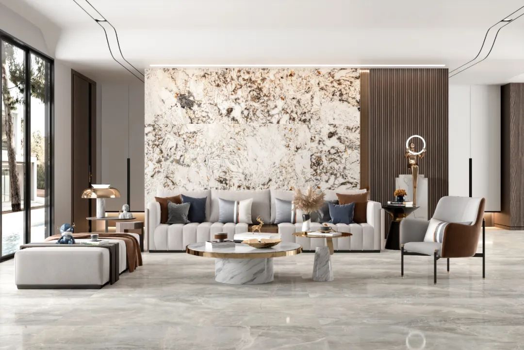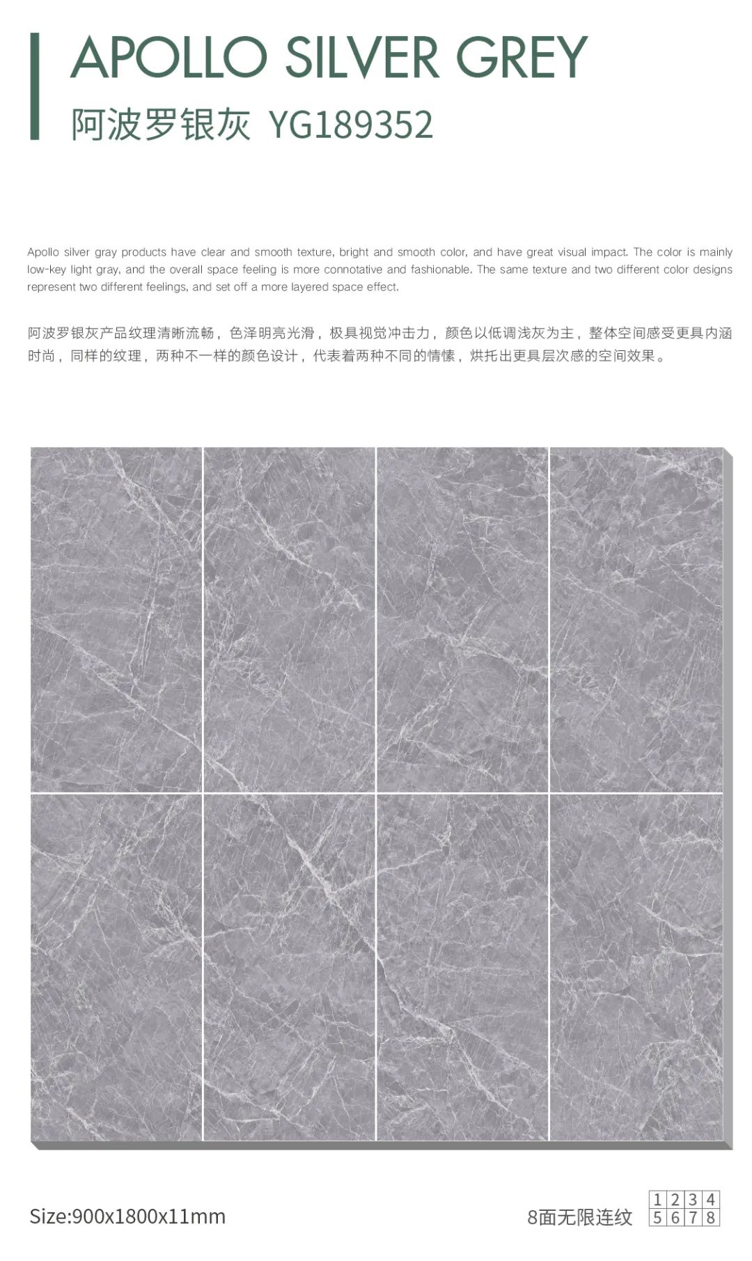 阿波羅銀灰產(chǎn)品紋理清晰流暢,色澤明亮光滑,極具視覺沖擊力,顏色以低調(diào)淺灰為主,整體空間感受更具內(nèi)涵時(shí)尚,同樣的紋理,兩種不一樣的顏色設(shè)計(jì),代表著兩種不同的情愫,烘托出更具層次感的空間效果。