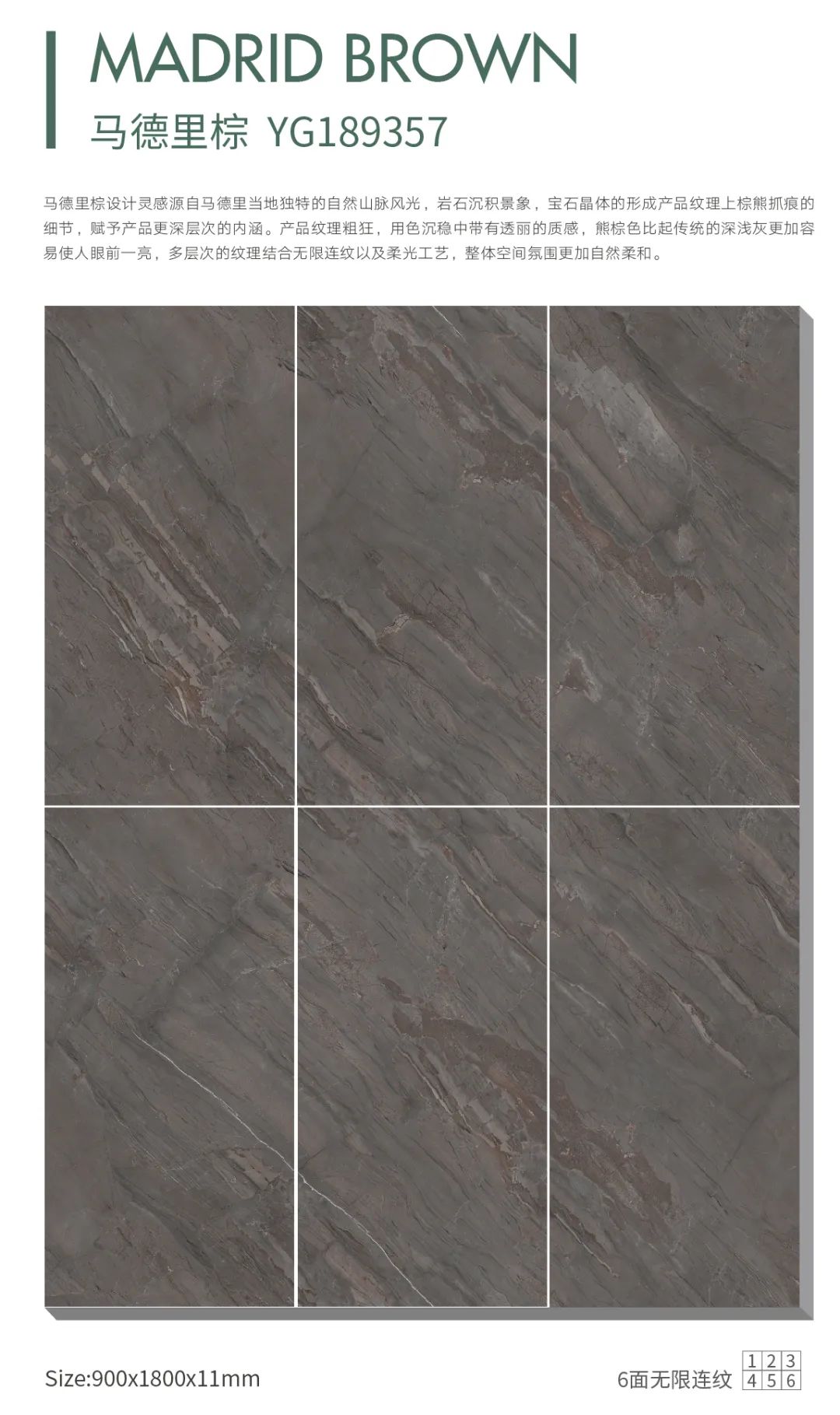 馬德里棕設(shè)計(jì)靈感源自馬德里當(dāng)?shù)鬲?dú)特的自然山脈風(fēng)光,巖石沉積景象,寶石晶體的形成產(chǎn)品紋理上棕熊抓痕的細(xì)節(jié),賦予產(chǎn)品更深層次的內(nèi)涵。產(chǎn)品紋理粗狂,用色沉穩(wěn)中帶有透麗的質(zhì)感,能棕色比起傳統(tǒng)的深淺灰更加容易使人眼前一亮,多層次的紋理結(jié)合無限連紋以及柔光工藝,整體空間氛圍更加自然柔和。